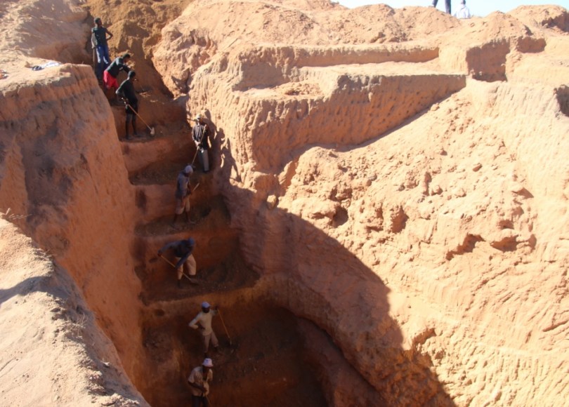 We walk around the area. There is a little hill which is actually just dirt from an open pit. Down in the pit a bit over a dozen men work. They just have a shovel each and they dig up the dirt from 10 meters down. It looks like very hard work – and the pay is awful. Apparently the standard pay for the workers in the mine is 10.000 a day – which is only 2½€. The reason they still want to do this hard work is probably the hope of striking it big since the workers do get a small share of the sapphires they find. So if they get lucky they might get more than the standard pay.