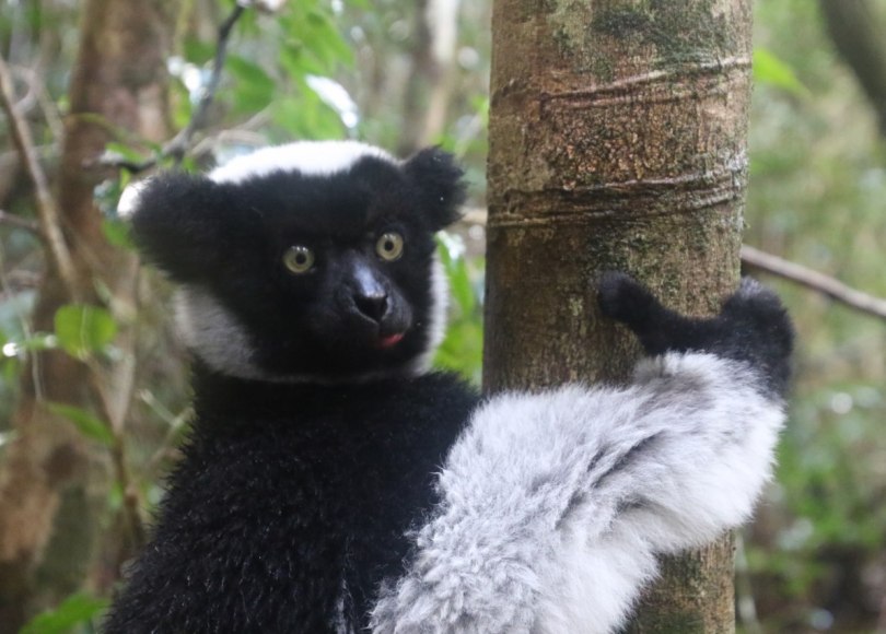 We start walking into the park to spot the indri. It takes a while but on the way we spot a little gecko on the way. The disadvantage of this park being so little visited is the guides can’t really share the information about where to spot the indri – since nobody else has been here to spot it today. So it takes a bit more searching to find the indri – fortunately we got a spotter walking ahead into some steep and slippery parts of the park to find the indri. After a while we find the indri and walk off the trial and into the actually forest to see the indri. With all the rain the hill is very slippery and you really have to take care not to slip when you are walking around inside the forest. Fortunately I don’t slip and find a spot from where I can take photos of the indri up in the tree.
