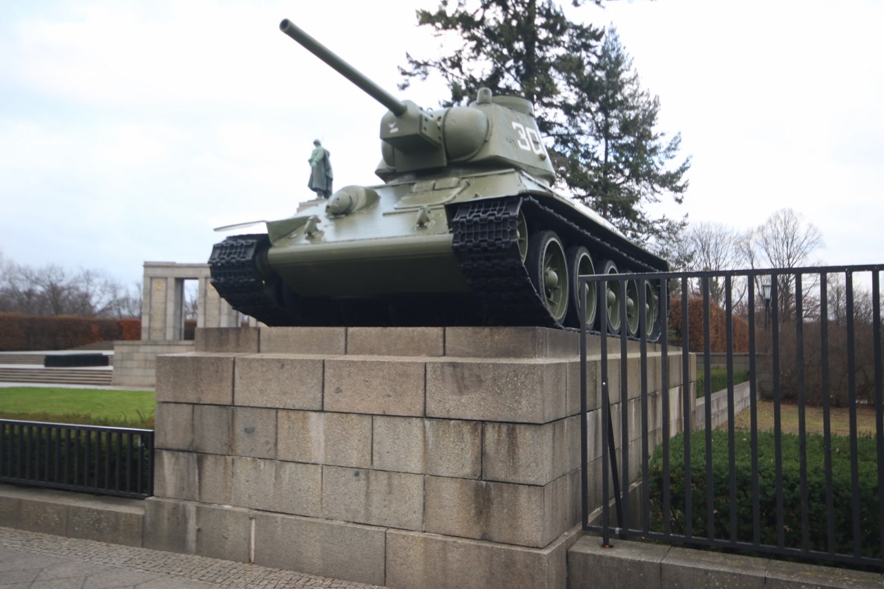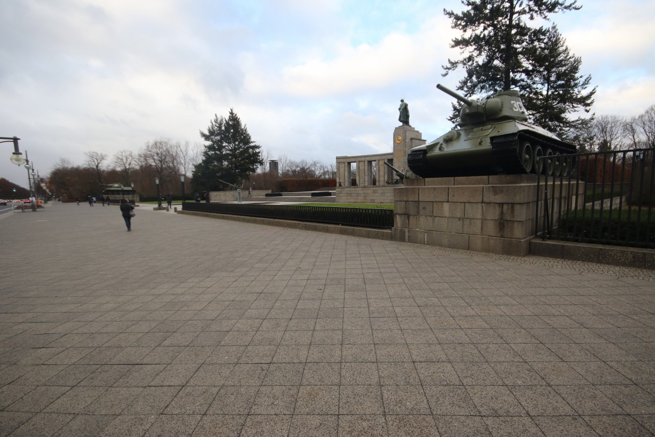 The monument is fairly small and is partly covered by the trees in the Tiergarten until you get closer to it. Then you will see the monument next to the street and the Red Army tanks standing on pillars below the monument itself. The Tanks took part in the final Battle of Berlin. The monument is the final resting place for 2,000 of the 80,000 Soviet troops who died during the final battle of Berlin. t