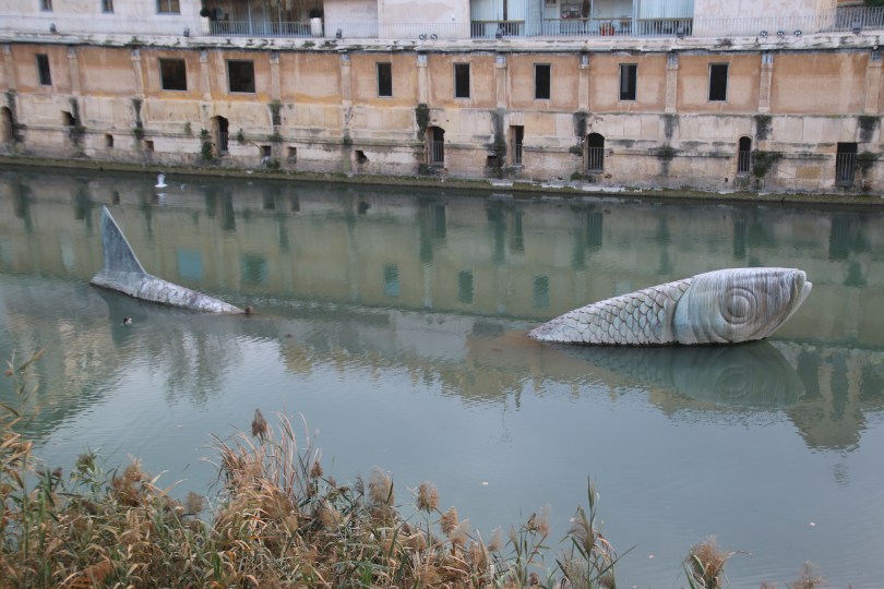 The center is dominated by many small squares and several churches – the churches might have been destroyed during the civil war but they have been replaced by new churches which looks nice. You can down to the river where a pretty old bridge crosses the small river – and down in the river is a giant fish swimming around in the shallow water.