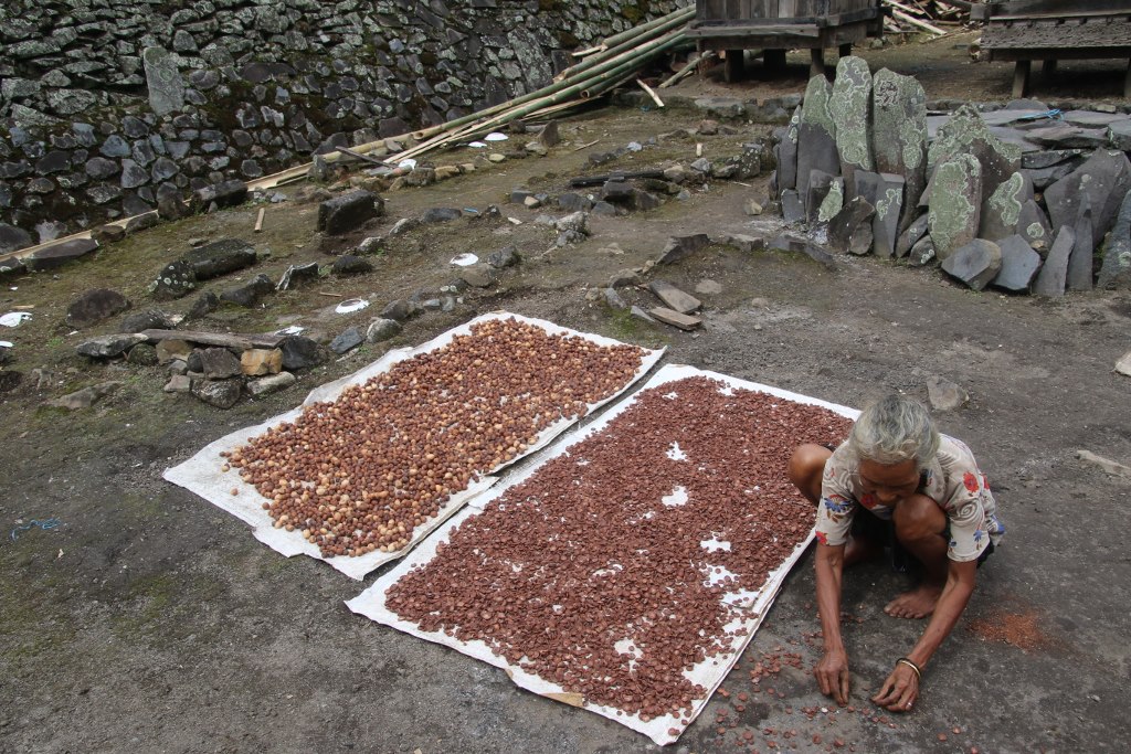 The island of Flores is generally very hilly and difficult to get around – but the area around Bajawa is possibly even hillier than the rest of the island. And before they built the road going across Flores this area was virtually impenetrable. Hence the people living here didn’t communicate much with the people living on the other side of the volcanic hills or down at the coast which you can actually see in the distance from certain view points in the area. The isolation has led the people of the area to have their own unique language which is only spoken by the people of the region and completely incomprehensible for people from other parts of Flores – hence they will have to communicate in the common Indonesian language Bahasa Indonesia.