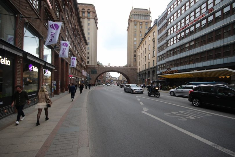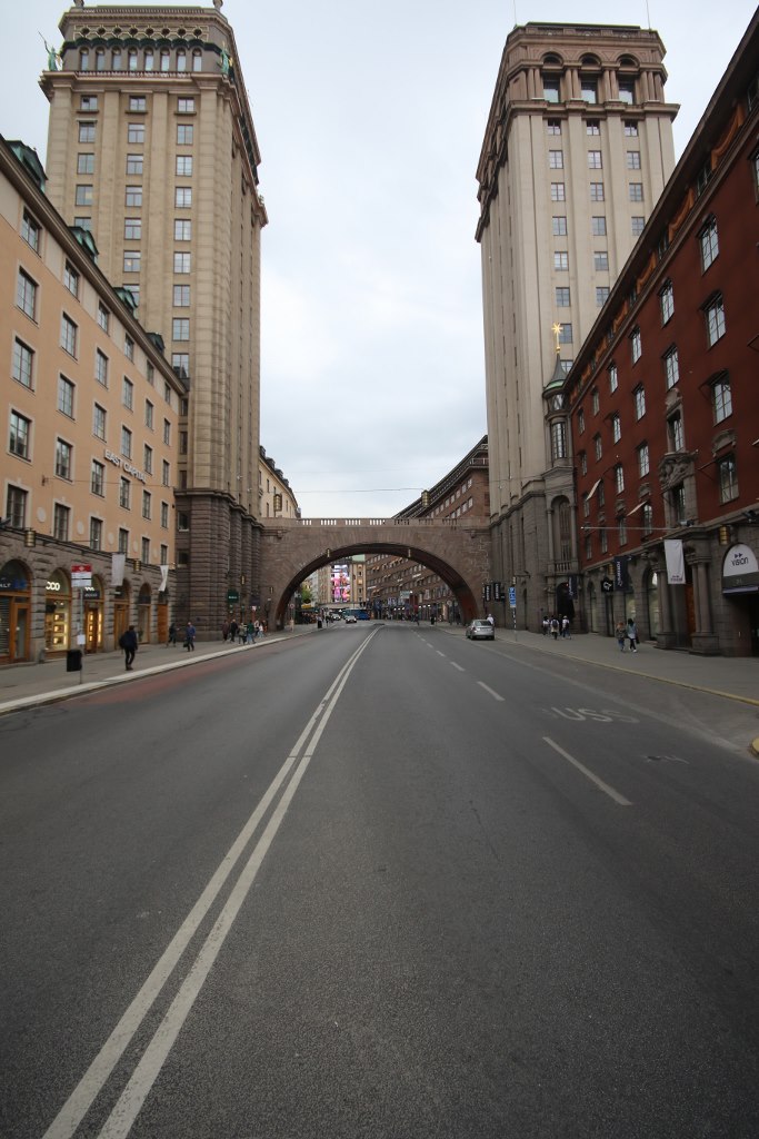 The plan was approved and in the 1920s they dug out a new road and build a bridge across the road. They did construct two skyscrapers called Kungstornen on each side of the street Kungsgaten. But this was Stockholm and not New York so the clouds would have to be pretty low for these 16 stores building to be able to scrape them.