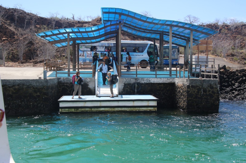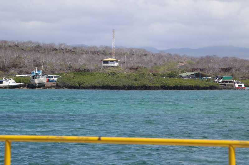 We get out of the airport and we rush to a free shuttle bus which is waiting in front of the airport. There is only a couple of seats left in the bus but we get to sit down for the short ride across Baltra Island to a ferry which will carry us across a small crossing to the bigger Santa Cruz Island. We get out of the bus and find our bags and then we head down to the ferry. Where we get the last two seats on the boat – we are on roll today getting the last seat not having to wait for the next departure. Across the water we get out from the ferry and we rush to a local bus which is waiting to fill up with passengers. There are only two seats left in the bus – which is fortunate since we get them and the next few passengers get on the bus but will have to stand for the next 45 minutes ride to the main city in Galapagos – Puerto Ayora.