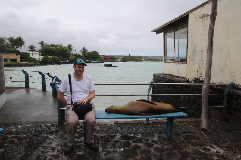After lunch we get down to the main road down at the water where we manage to spot our first bits of wildlife. We walk along the road and we get to a bench down at the water – like you would expect a bench down at the water will attract somebody to occupy the bench. This is also the case in Puerto Ayora where the bench is working as a nice level place for a sealion to have an afternoon nap. The sealion looks so nice and friendly – but you should always remember the animals around here are wild and you should keep a distance of minimum 2 meters or 6 feet’s at all times. So obviously I keep a distance of approximately 2 meters – more or less.