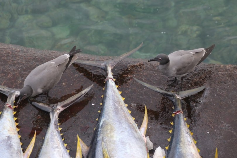 The fishermen around here also manage to catch fish. There are fish down at the harbor which the birds try to eat a bite of the tail – but the fish shops around here is less interesting than our favorite fish shop in Puerto Ayora.