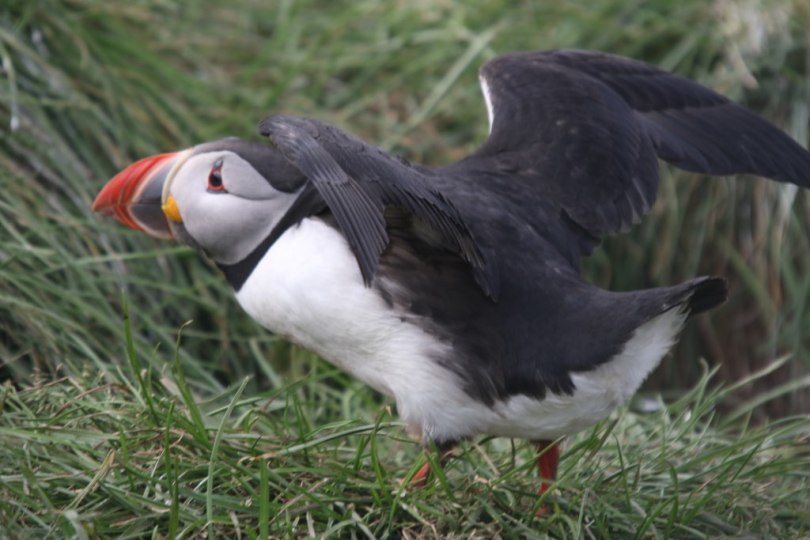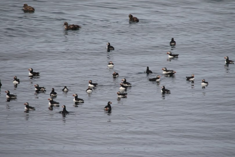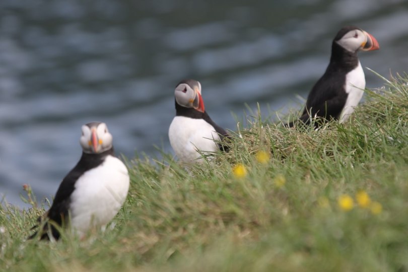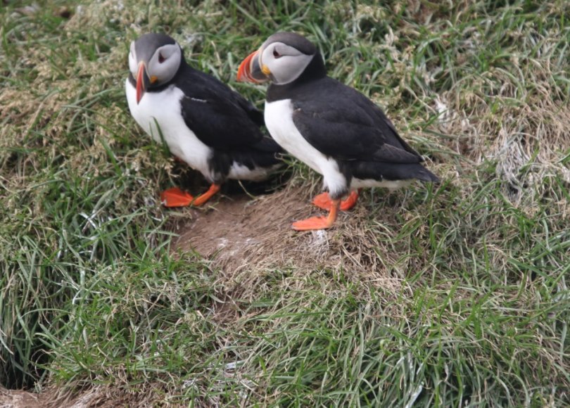 We stay and look at the many puffins which come to the hill to lie on their eggs and relax after having caught some fish in the water below. From time to time some of the puffins take off and go down to the water below to swim around for a bit and possibly dive below the surface to catch some small fish.