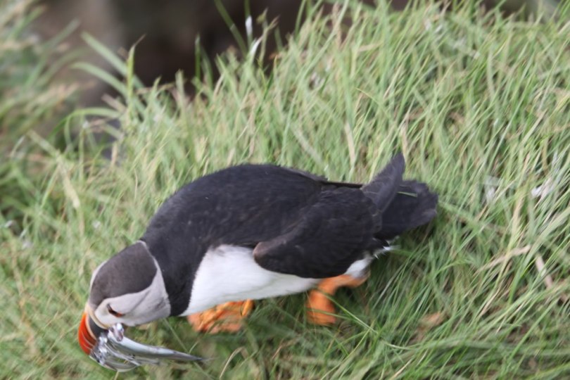 From time to time the puffins return with the beak full of fish – but there are pirates in the neighborhood which are much bigger than the puffin and want nothing better than stealing the fish from the puffins instead of catching fish themselves. So when the puffins return they quickly head towards there small burrows to deliver the fish at the right spot before some other birds steal it from the small puffin. The puffins are surprisingly fast when they return and run underground in only a few seconds.