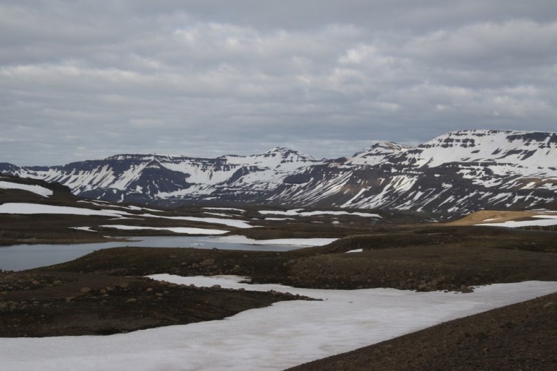 We drive out to another of the fjords of east Iceland and the road goes up over a little ridge. The ridge isn’t very high only 500-600 meters and it is in the middle of the summer with almost 24 hours of daylight a day. But the weather up here is cold and there is a lot of snow and ice along the road. I had actually checked the road conditions in Iceland the week before we left and there had been a day in the middle of June where the road conditions on this road said snowing and difficult driving. I guess summer at the edge of the arctic is different from what I am used to.