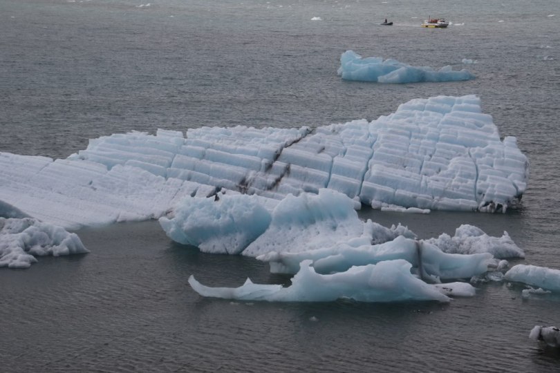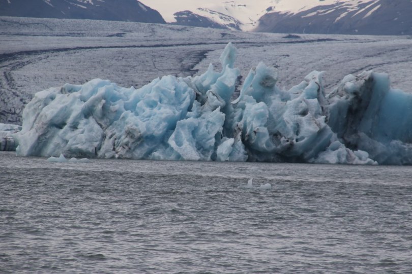 We walk along the shore of the lagoon to have a closer look at some of the icebergs. They are here in different shapes and colours which apparently has something to do with the way they have broken off from the glacier, melted and then refrozen again. It is nice to go and see the many icebergs in so many shapes. There is a small hill you can walk up on top of to have a little look of the lagoon from above. There are signs along the shore telling you not to go swimming – I must admit I didn’t really need a sign to stay on land – the huge amount of ice in the lagoon was enough to ensure I would stay dry. A few ducks didn’t seem to be able to read the signs so they did swim around on the freezing cold water with there ducklings.