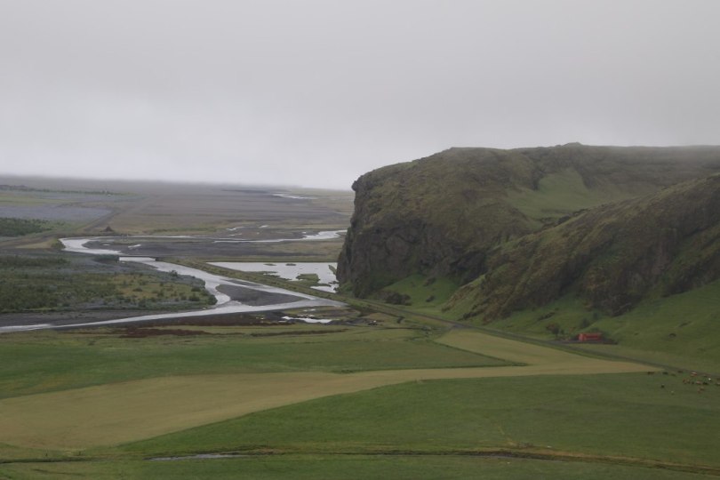 After getting wet at the bottom it is time to take the stair to the top of the fall. It is a fairly steep walk but it doesn’t take long so soon we reach the top of the fall. From there you can get a view of the black sandar landscape below with all the crumbled basalt rock which has been taken here by the melt water from the glacier whenever a volcano erupts below the glacier. The view of the sandar is probably more interesting than the view of the top of the waterfall since you don’t really get a very good view of the falls from the top.