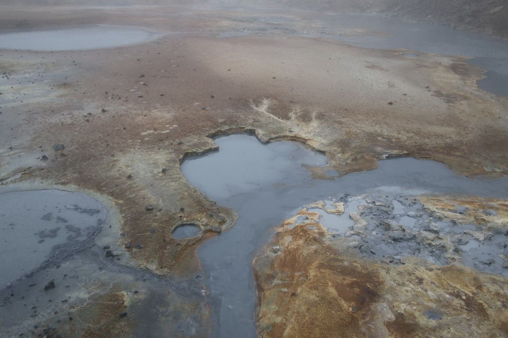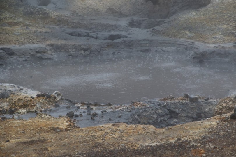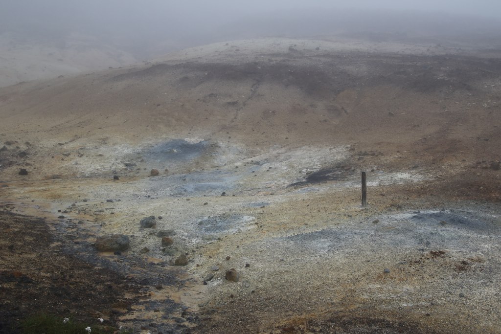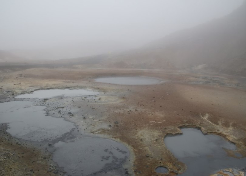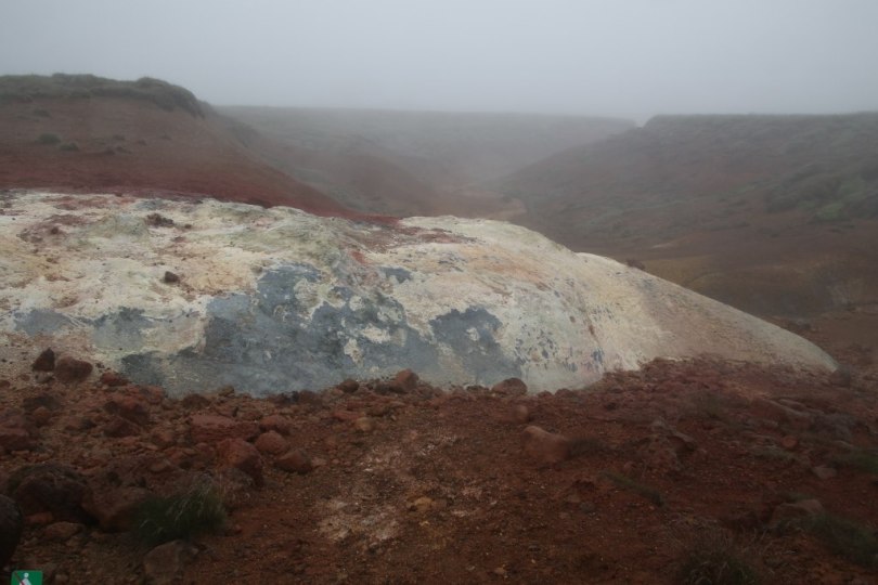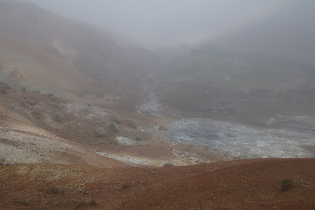 We head up a little road up in the hills. The fog just gets heavier as we drive up the hill. After a bit we arrive at a geothermal area called Seltun. We park the car and start to have a look around the area. There are a lot of smaller hot pools with different coloured hot water but it is actually a bit hard to see the area because of the fog so walking from one spot to the next you can hardly see where you are going. At the different hot pools the view is obscured by the fog so we can only partly see the geothermal features of the area. We don’t stay as long as we would have if the conditions had been better and drive down the hill.