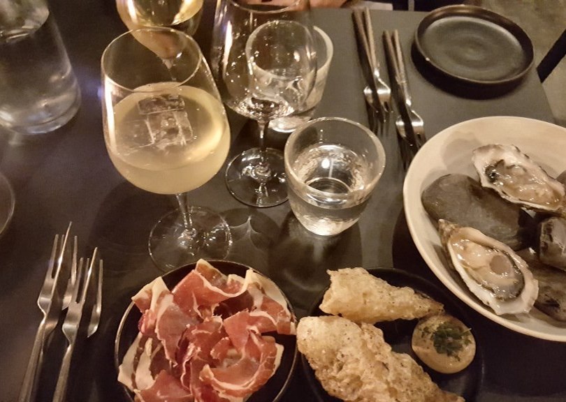 For the first snack we got fresh and delicious oyster, follow with prosciutto, crispy fish skin and bread.