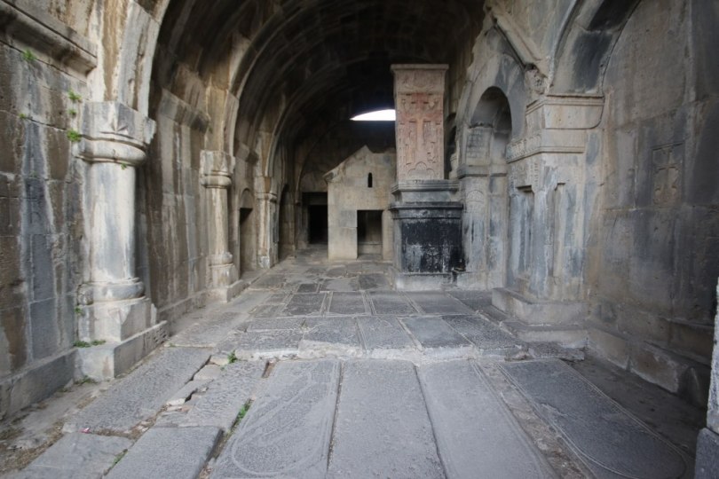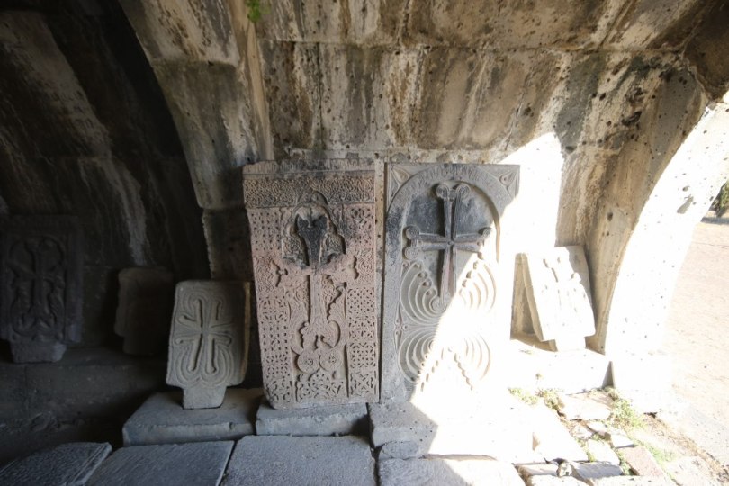 The complex is fairly big compared to some of the Georgian churches we have been to and it is interesting to look at the different construction of the Armenian churches compared to the Georgian churches – despite the close proximity of the countries there is some marked differences. Here there doesn’t seem to be any frescoes in the churches – what there is instead are rock carving. Particularly the famous khachkars are present in great numbers. The khackars is a cross in stone with carvings – and some of the carvings are pretty amazing.