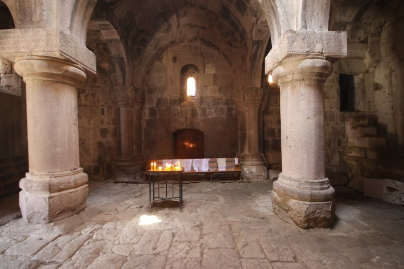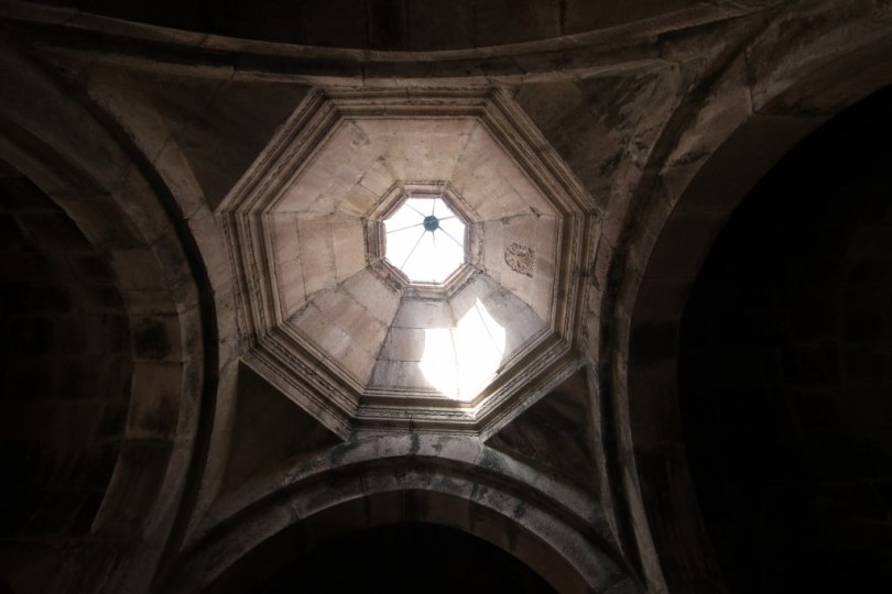 We leave the Haghartsin monastery and drive back to the main road where we drive a bit further to the north to reach the second big monastery of the Diljan National Park. We arrive at the Goshavank monastery which is a pretty big monastery on the top of a small hill.