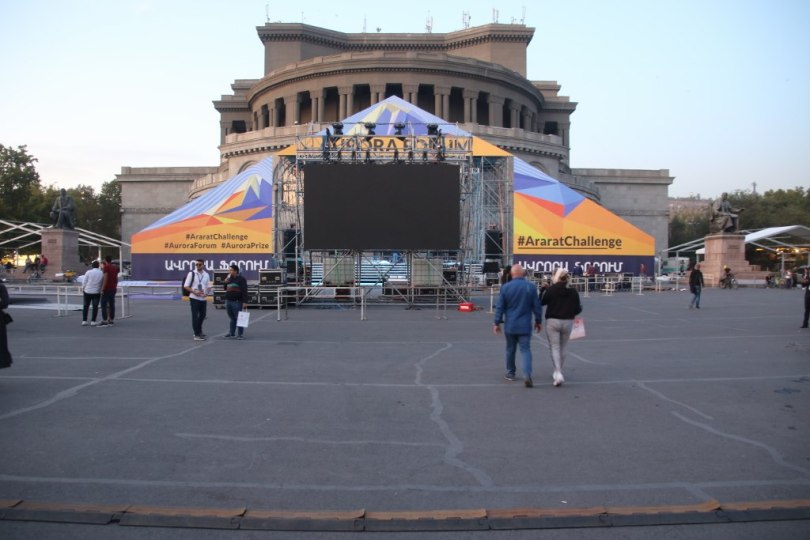 From the Republic Square we walk a bit further to the north until we reach the main pedestrian street of Yerevan. We walk up the pedestrian square until we get to the opera building. The opera building is one of the main buildings in the city and the round building is dominating the Freedom Square. I think the opera house is the most interesting building we see in all of Yerevan.