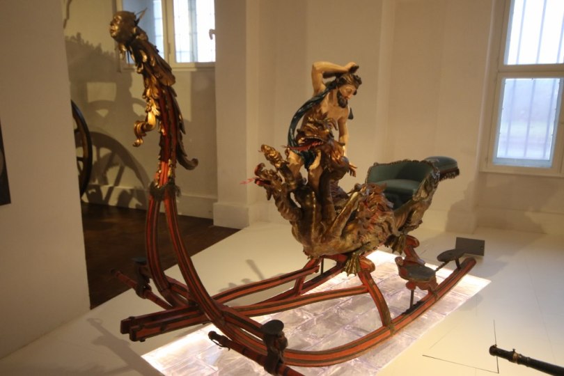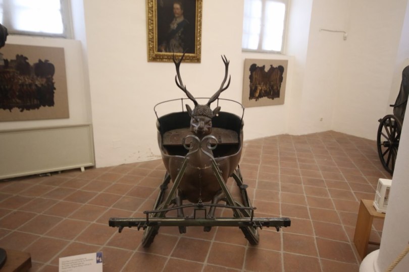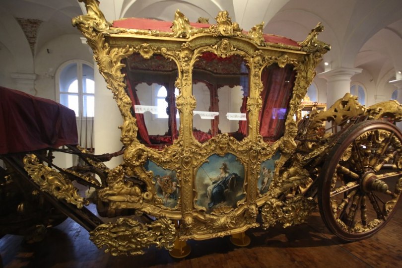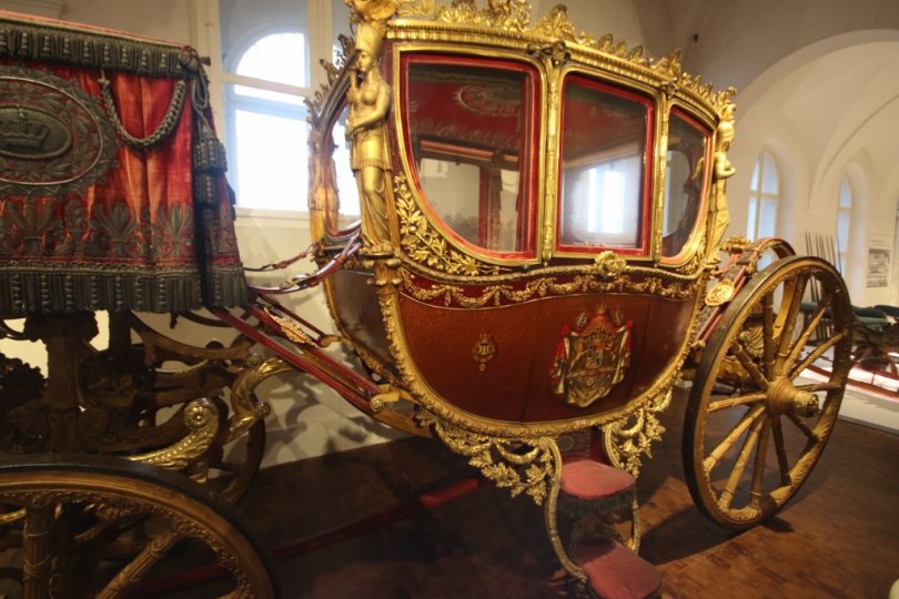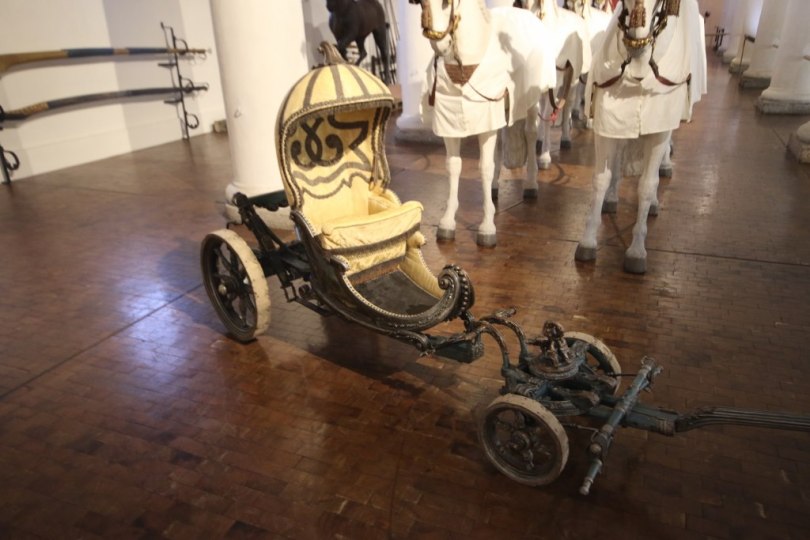 There are a few more prestigious coaches in the collection in addition to some sledges used to transport the rulers during the cold month of the year. Some of the sledges are also pretty elaborately decorated and there is a model of a horse on display dressed in special cover with a lot of bells making the horse jingle when it was running across the snow with the sledge. When you move by the horse there is a recreation of the sound of the jingling of the horse.