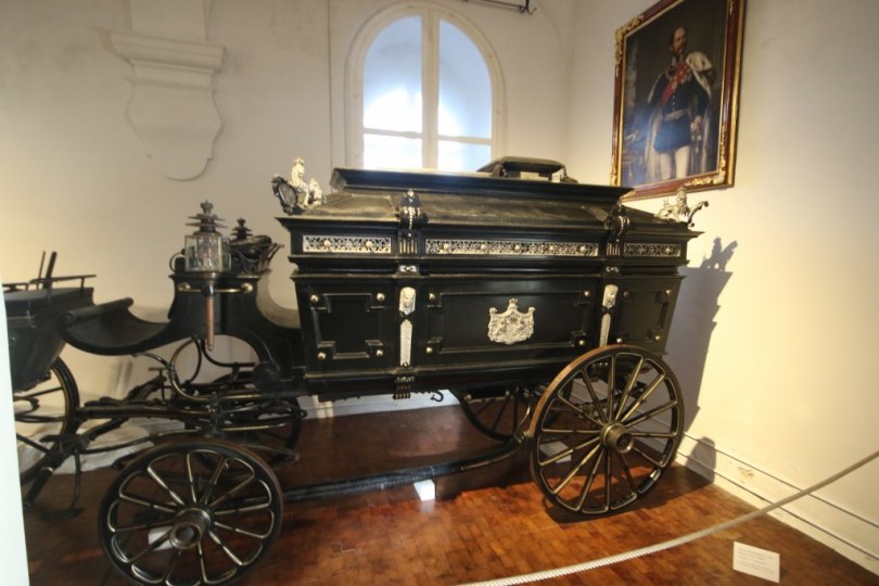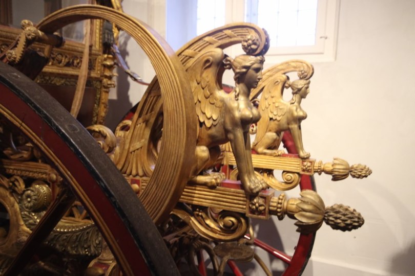 When we finished the main part of the museum we walked across the cobble stones of the gate to look on the other side. Across the street there is an extra part of the museum. It contains several more coaches – though they are not quite as prestigious as the main exhibition. So we don’t spend as long looking at these coaches but they do give an impression of how a more standard coach looked in the old days before the invention of the automobile.