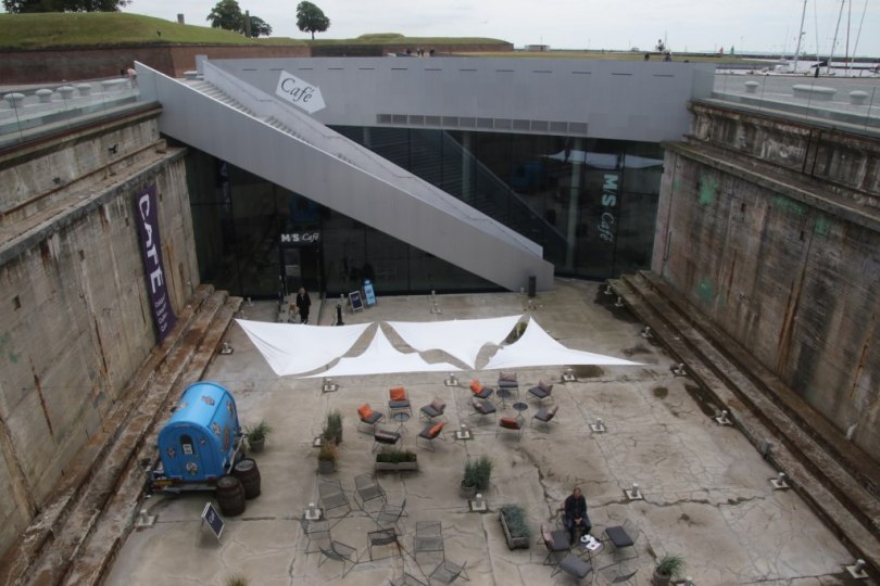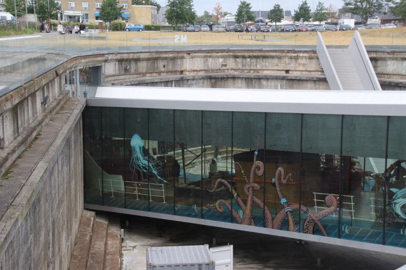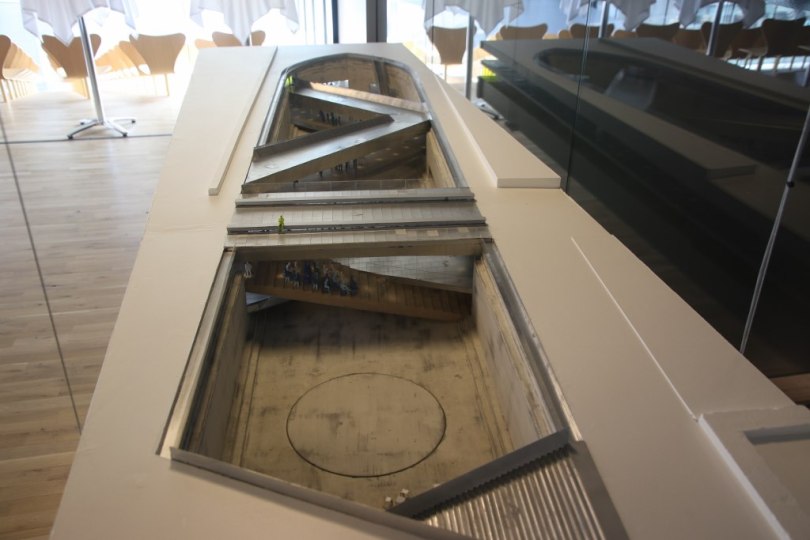 To make the museum they called for a competition among architects – and in the end the competition was won by Bjarke Ingels and the BIG architect firm. Their solution to the design of the museum was quite ingenious. They didn’t actually build the museum inside the dry dock – instead they dug out the museum in the area next to the dock creating an underground museum with a view to the old dry dock. Inside the dock there are a couple of bridges across from one side to the other side of the dock. The bridges have large glass walls so you can look out at the old dock to see it from inside.