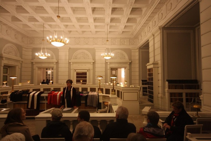 We walk around the building and at one place there is a collection of all the people who has been sitting on the Supreme Court. It is pretty interesting to see the older pictures because some of the names sound familiar – for instance there is a man called Niels Juel on the portraits – he was one of the most famous naval commanders in Danish history famous for his victory in a decisive naval battle against Sweden in one of the many wars between the two countries.