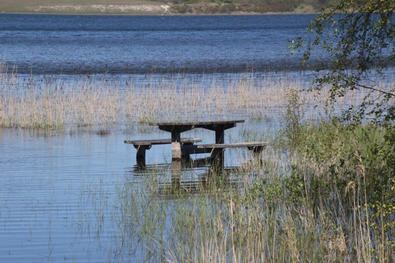We park the car close to the shore of the lake. There is a couple of table at what probably should be the lake shore – but it seems like the lake is overflowing with water from the heavy rain which happened during the last half year. So currently the table and bench are not in use since it is in the water at the edge of the lake.