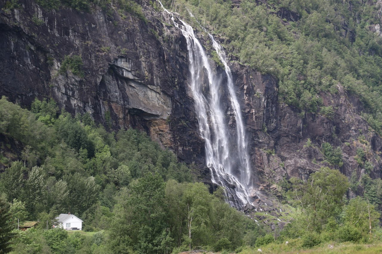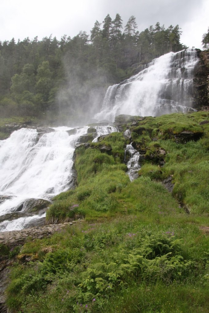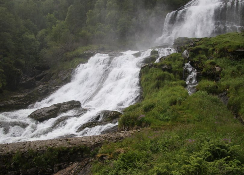 If you go to the top you might consider putting on your waterproof jacket if you don’t already have it on due to the unreliable Norwegian summer weather. The water fall is making a bit of a splash with the tumbling water and at certain places you will get a bit of a spray – though the spray at other waterfalls are a lot worse than this one.