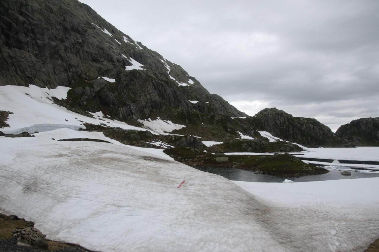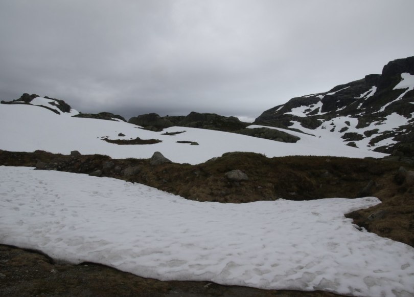 The lakes up here containing a lot of melt water still has a lot of snow and ice on top of the lakes – so the landscape doesn’t really look like what you would expect during the middle of summer. But in the mountains of Norway the summer comes late and even here at an elevation of only around 800 meters the snows seems to stay until late in the summer – possible some patches will never melt before the winter return early in the fall.