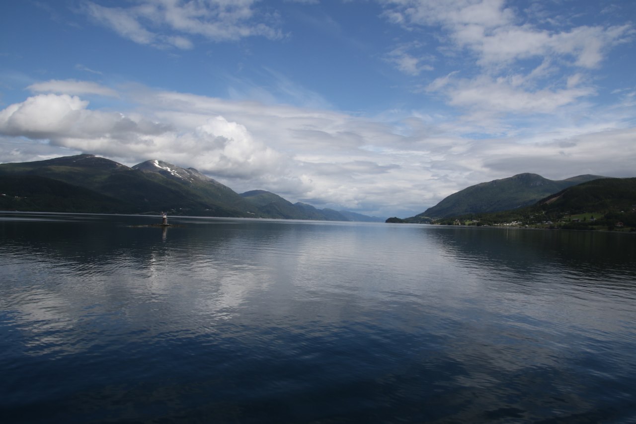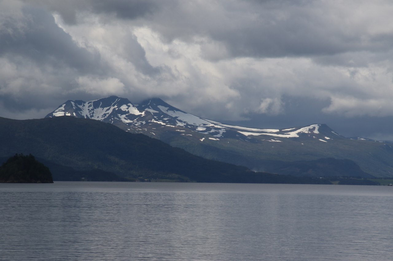 The ten minutes sail is plenty of time to enjoy the view from the upper deck of the fjord with many small mountains. The mountains are not very high but we are getting further and further north so the summer temperature up here is modest and the snow stay even at low elevations. When heading off the ferry in Sølnes it is only a short drive to Molde through a tunnel under another fjord where they actually have replaced the ferry service by this tunnel.
