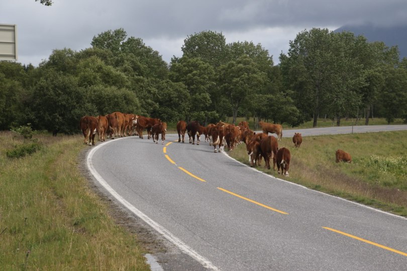 Cows blocking the road at Tjøtta war cemetery