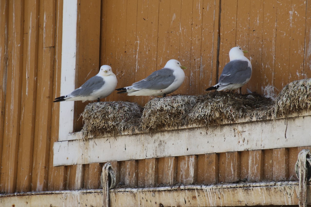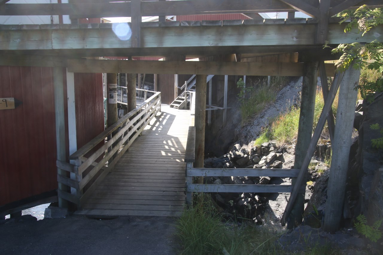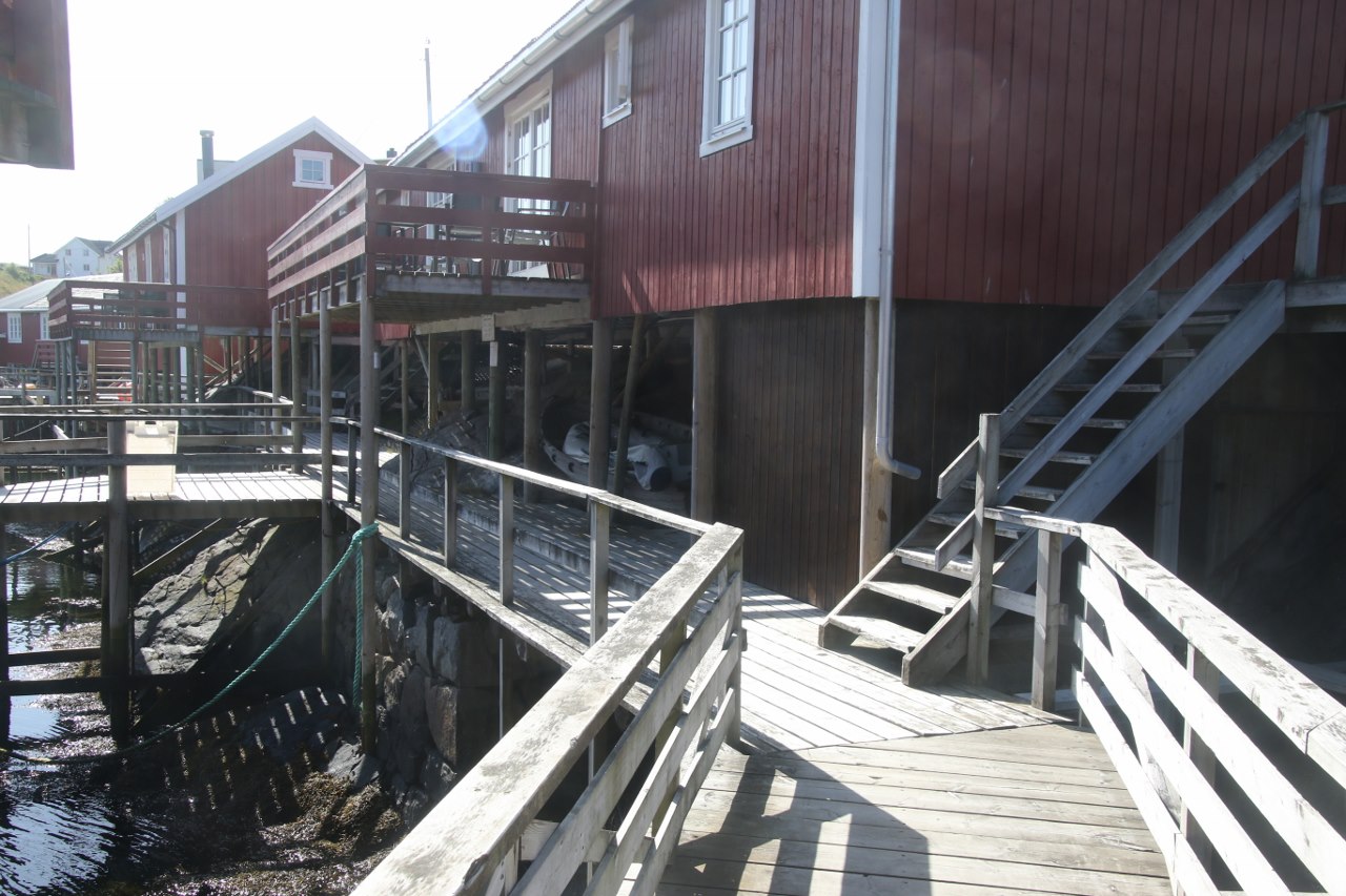 We get down and walk around the old fishing houses which is called rorbuer. The old houses are built on stilts out in the water and there is actually a little bit of a walkway between the stilts under the houses down at the water.