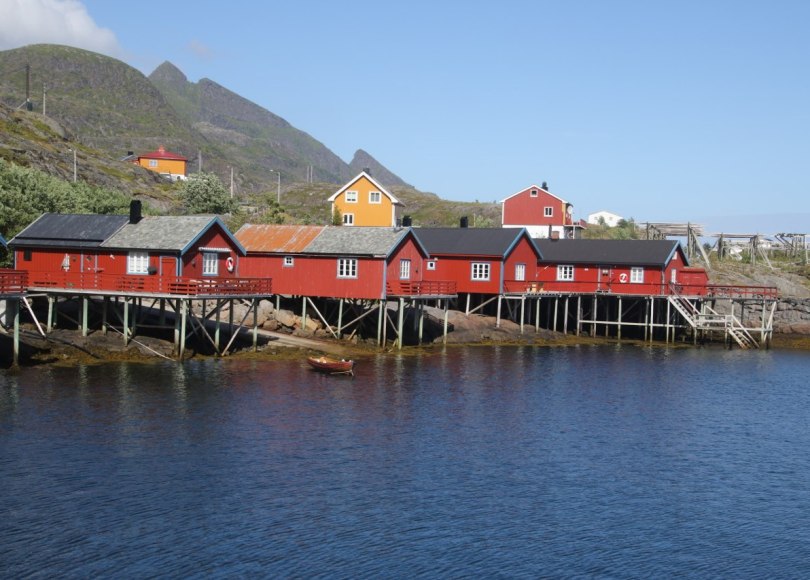 We get down and walk around the old fishing houses which is called rorbuer. The old houses are built on stilts out in the water and there is actually a little bit of a walkway between the stilts under the houses down at the water.