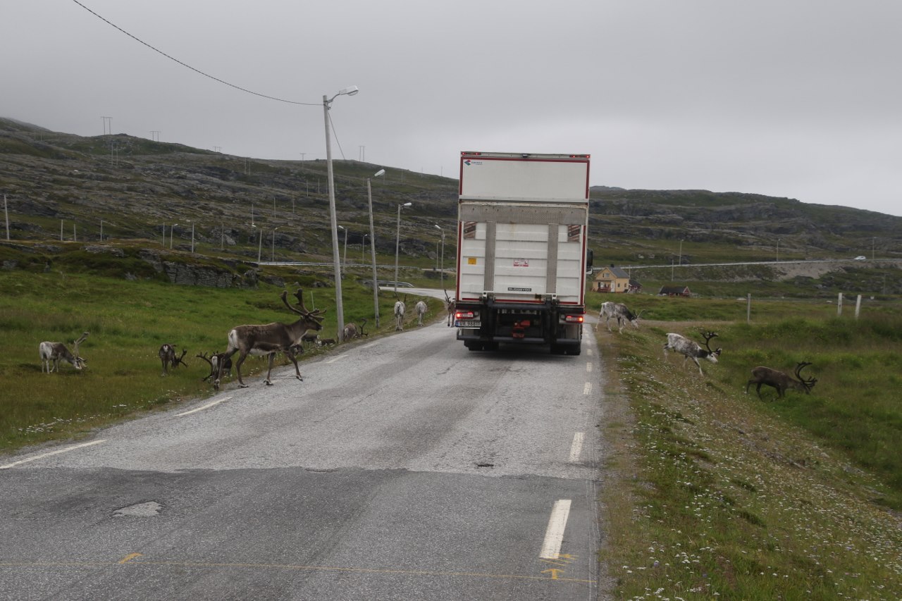 As we drive north we finally spot one of the famous animals of the north – the reindeer. The reindeers up here are actually domesticated animals a bit like the cows in the southern part of Europe. But unlike the cows the reindeers walk freely around large areas of the north of Norway with no fences around them. During the summer the Sami drives their herds towards the coast so when we drive around the coast of northern Norway we do spot reindeer from time to time.