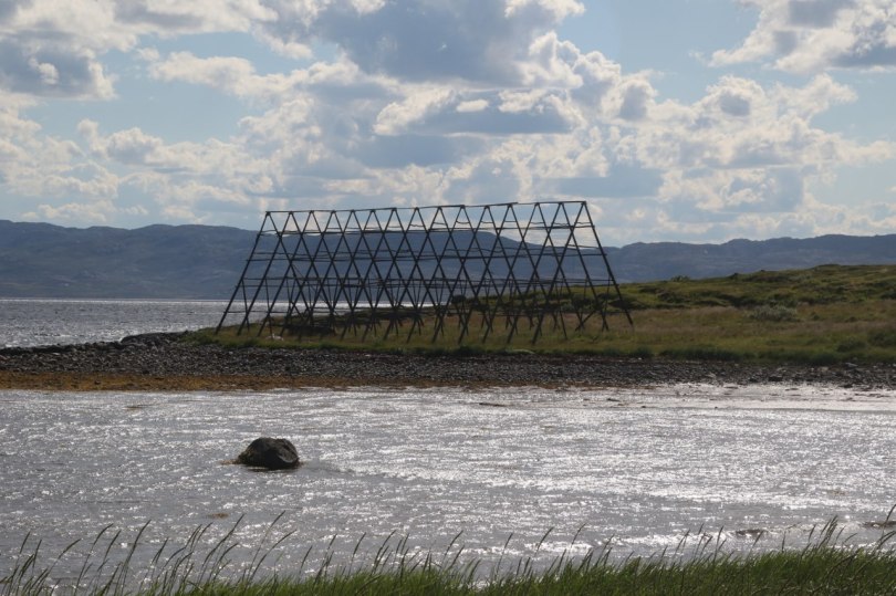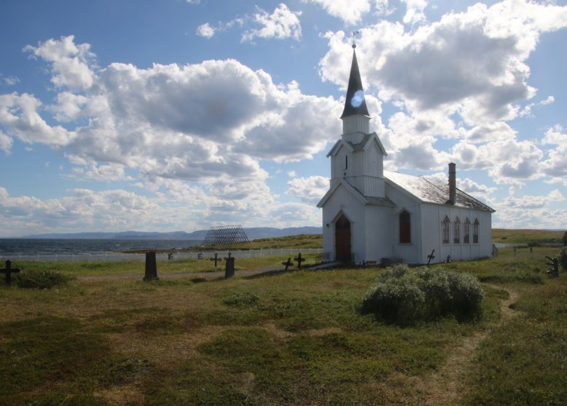 Next to the church is pyramid shaped construction. This is an old fish drying rack which has been left behind from the 1950s when it was constructed. They had to build a new fish drying rack since the old racks had been burned during the German retreat. This construction was actually different from the older racks which had been lower. Thanks to the new construction the fish were higher above the ground so there was less insect infestation. They also changed the way they put the fish on the rack to speed up the drying process. There is actually a little sign next to the church telling the history of this traditional fish rack. The church makes a nice little place to break the journey before we continue the days drive.