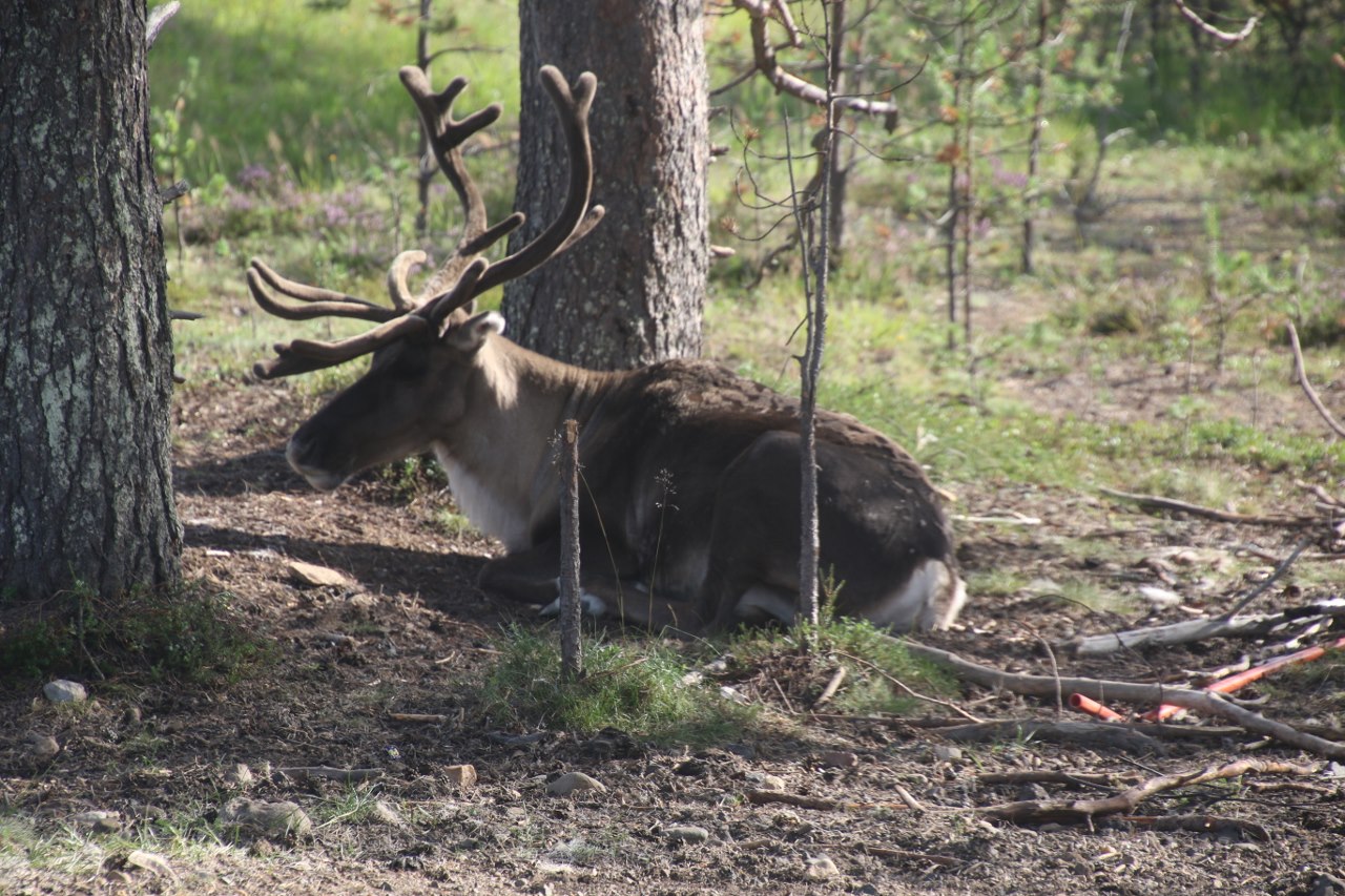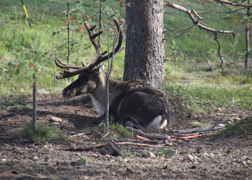 We are standing close to the big reindeer which were resting under the tree and several of the reindeers come close to us. After a while we are surrounded by reindeers and they don’t mind us close by as long as we are not touching them – too much. It seems like they don’t mind if we touch their antlers a bit. The antlers are very soft since they still have the protective skin they had when they grow them during the spring and early summer. It isn’t until the autumn they will get rid of this protective skin when the males get ready to fight for the females.
