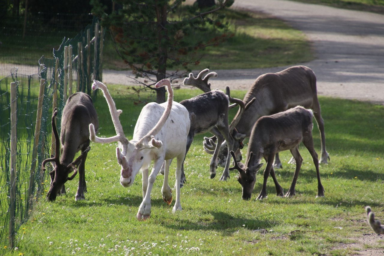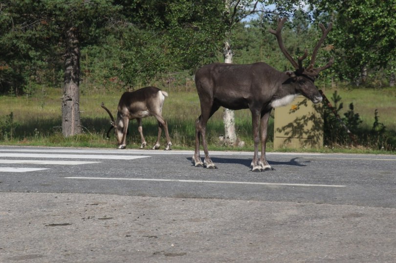 We look at the reindeers – at first there are only a couple of reindeers crossing the road and a big one resting in the shade of a tree. We stay looking at the reindeers for a little bit – and much to our surprise more reindeers start arriving. First another couple comes from across the road. Then more reindeers comes from the other side and suddenly more are coming from a little side road.