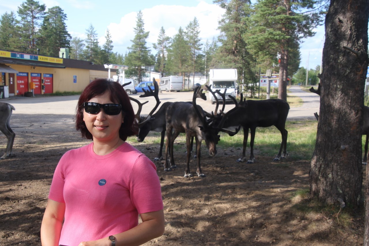 Suddenly a couple of reindeers are actually walking across the road in front of us and there is a gas station right at this spot as well. So we decide to stop here for a while to take the daily reindeer photo.