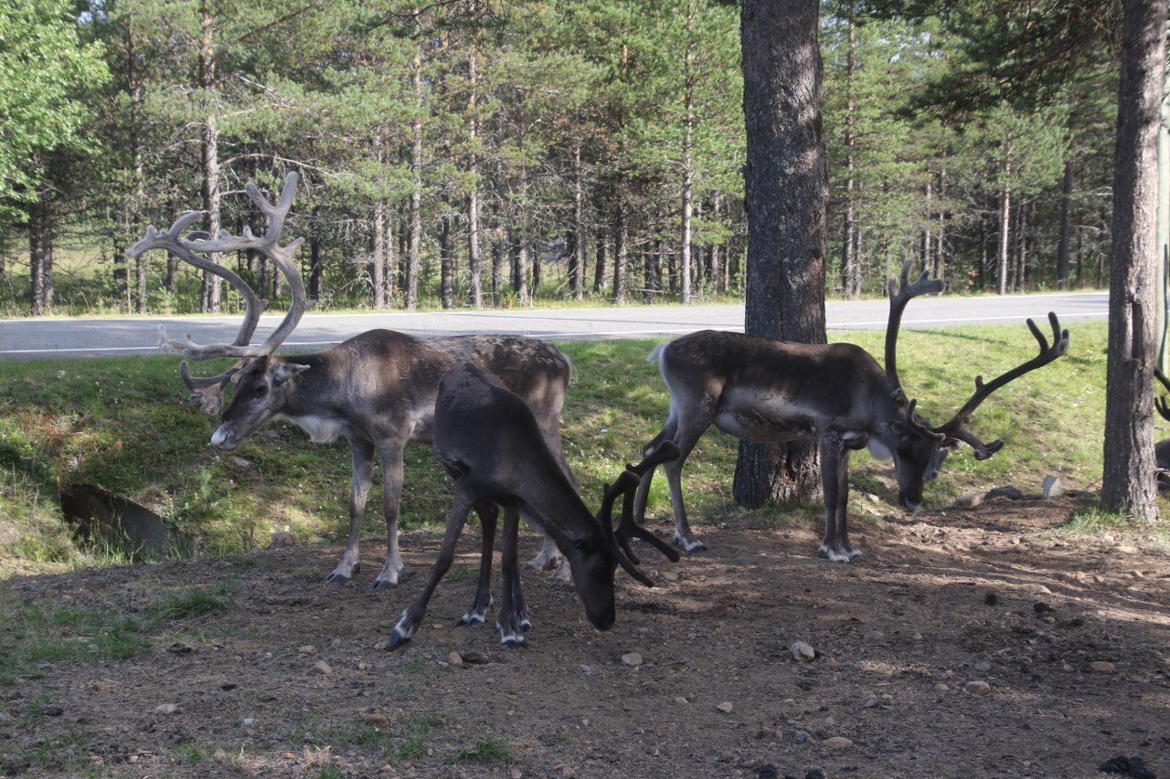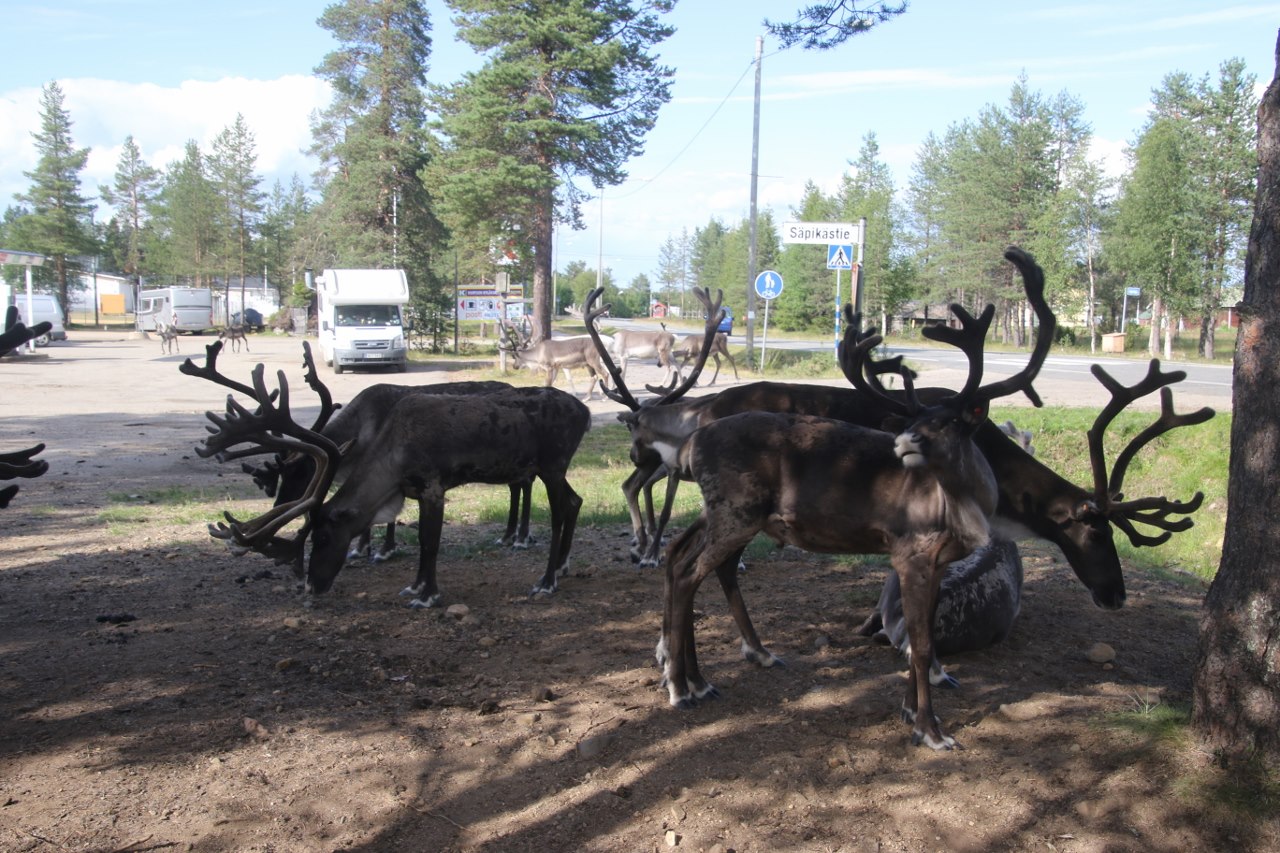 It looks like this is the afternoon meeting place for reindeers in this area where they come to discuss the issues of the day while they can relax in the shade of the trees along the road.