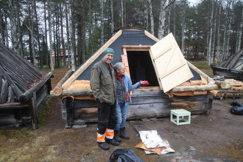 When we walk around the area we actually meet a couple who are repairing one of the huts. It is a Swedish Sami couple where the hut has been passed down to the wife and the husband who is of Swedish origin is helping her repairing the hut. They are very eager to talk – and I think a part of the reason it takes them so long to repair the Gåthie is because they like to talk to all the visitors. They show us the inside of their hut and their storage unit which they close using an ancient lock which might be several hundred years old. The current storage hut is actually more than two hundred years old – surprisingly the ancient wood can keep for a long time in these woods.