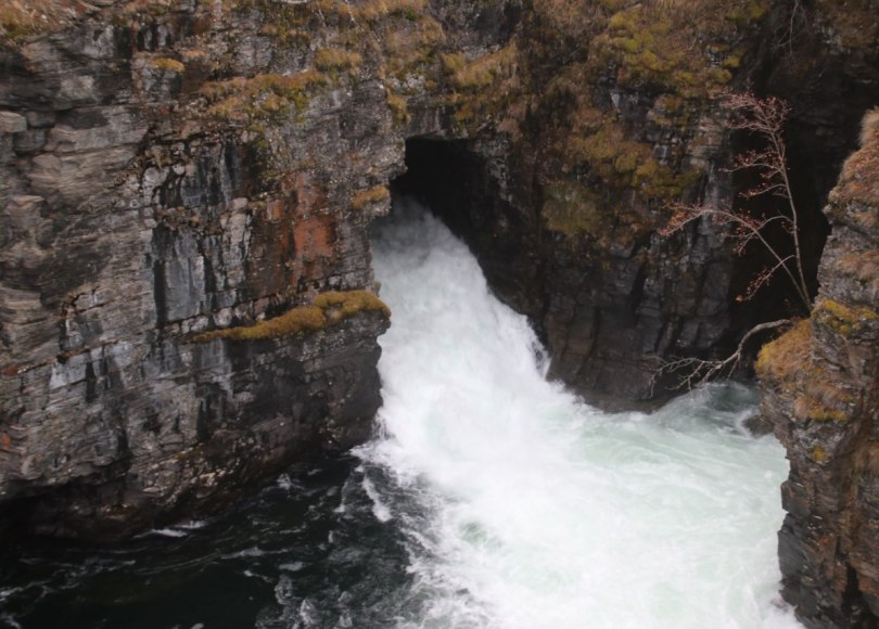 We can see a map of the area at the visitor center – there are a few different small trails and we decide to take one – it do lead a long way into the mountain behind which will take a couple of hours – considering the poor weather which may or may not turn into rain at any moment we decide against any major hikes and decide just to walk part of the way down towards the lake. This little trails takes us pass a special waterfall. The river runs down from the mountain and then it is blocked from the lake by a solid rock. The river solved this problem by slowly over the millennia by drilling a hole in the mountain. So the river actually runs right through the mountain down to the river below.