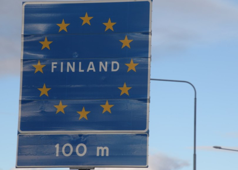 Unlike yesterday the weather is better today with some sunshine breaking through the cloud cover – so it is a lovely drive along the road north. We reach the small town and then we spot a sign to go across the border to Finland across a bridge over a river. We head across the river and get stopped at the border where they ask where we are from.