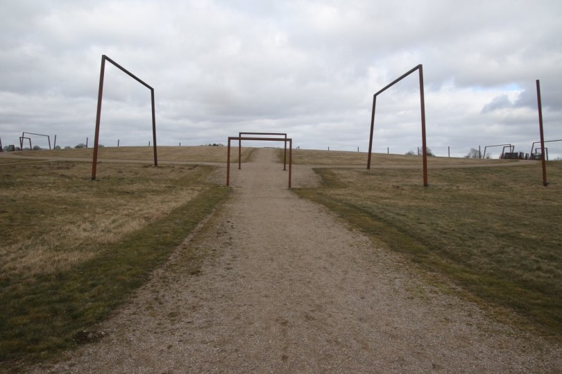 We go in and up to have a look from above at a little entrance gate with a stair to the top. From here we can see the area. There really isn’t a lot to see since there is nothing left of the original fortress – the mound around the fortress is gone so the only thing you can see is some markers they have put at the location of the fortress.