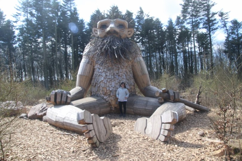 We head to the highest hill at Ashøj and park the car and walk a little bit inside the forest searching for the troll. It doesn’t take long before we spot the giant sitting in the woods and head towards him to have a closer look at the giant.