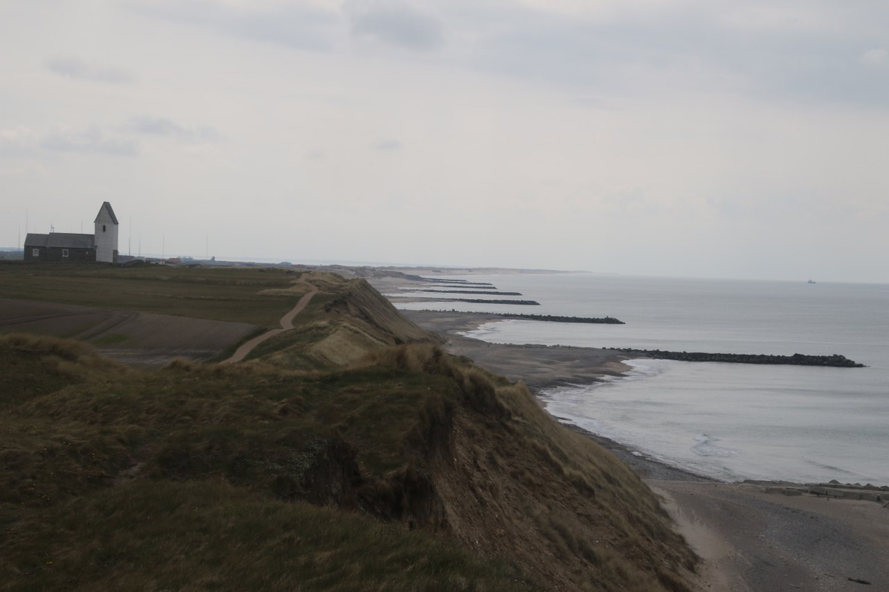 The area in front of the light houses is a long section of cliffs which stretch down to the beach. There is a trail along the ridge has some great views and it is worth walking at least some of the distance to the next village to enjoy the view. Down below the cliff you find a wide sandy beach which is protected by a series of groynes. The groynes were put in place in the 19th century after the water had been moving the coastline backwards in a disturbing pace for about 50 years.