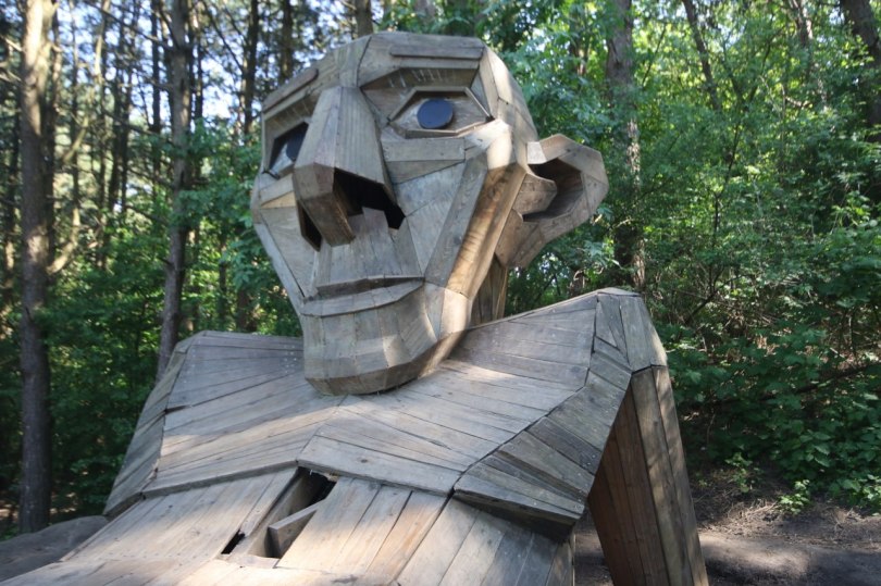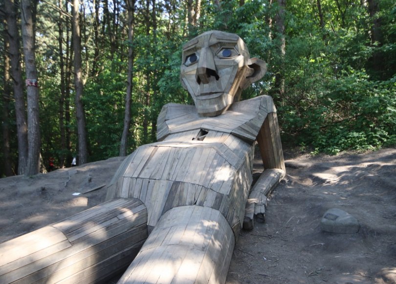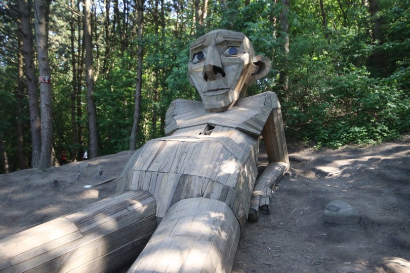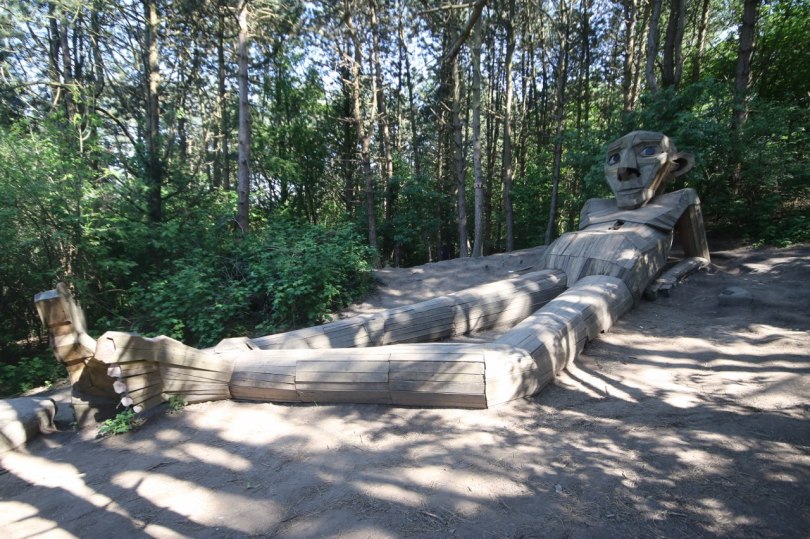 Thomas is one giant troll lying on a mountain in the Copenhagen suburb of Albertslund. He is made from scrap wood like all of his family.