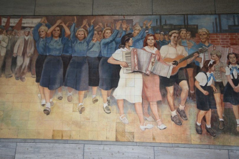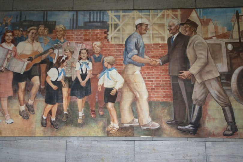 During the communist rule of the country the square had gotten a mural to happy communist workers of East Germany who apparently was always happy with the communist party and the socialist way of life.