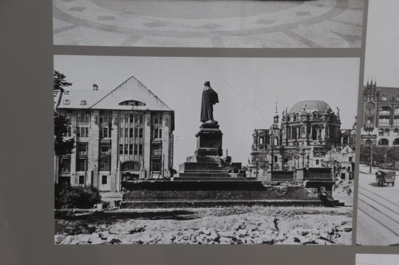 In Berlin you find the remains of a monument to Martin Luther are located in front of Marienkirche in the center of Berlin close to the television tower on Alexander Platz and the Rotes Rathaus (red city hall). The monument isn’t quite what it used to be. During the Second World War the original monument were broken down since there was a lot of metal in the monument which could be used for the German war effort – only the central statue of Martin Luther were saved.