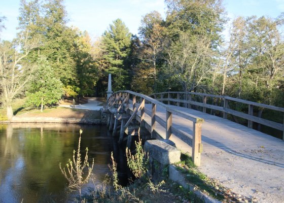 The first battle of the American Revolution took place on a small wooden bridge in Concord Massachusetts. You can go and visit the national park here which is keeping the memory allive.